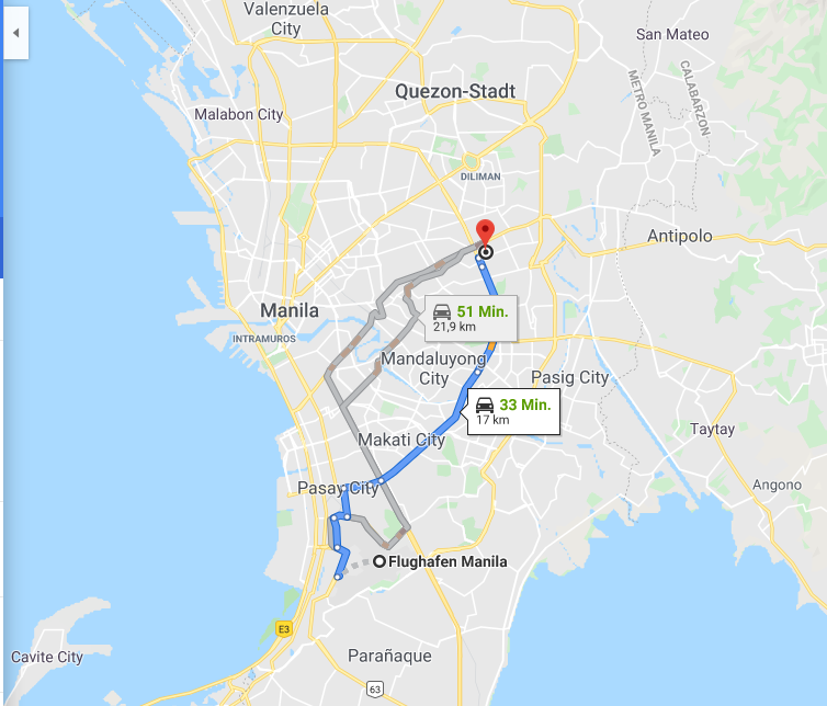 Draußen am Taxistand weiss man erst mal gar nicht so recht, welche Taxis vertrauenswürdig sind. Man wird schnell abgefangen und gefragt, wo es hingehen soll. Je aufdringlicher die Dudes sind, desto skeptischer sollte man sein. Irgendso ein Shuttle-Unternehmen wollte uns für die Fahrt zu unserem Hotel im Stadtteil Quezon fast 3000 Pesos abknüpfen, also 60€ -70€. Ja ne ist klar, richtige Abzieher! Wir fanden ein normales Metered Taxi und zahlten am Ende ca. 600 Pesos (10€) für die 15km lange Fahrt zum Novotel. Eine gute Alternative ist es natürlich immer ein Uber-Taxi zu rufen.